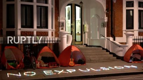 A live feed of the front of the Ecuadorean embassy in London shows several tents pitched around the entrance as supporters stand vigil for the besieged journalist, who has become little more than a prisoner in the embassy in which he sought political asylum seven years ago. “NO EXPULSION” is spelled out in LED lights on the sidewalk in front of the embassy, while numerous cameras are positioned across the street.