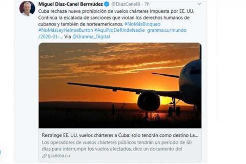 "Cuba rejects new ban on charter flights imposed by the United States. The escalation of sanctions violates the human rights of Cubans and of Americans," the president tweeted.