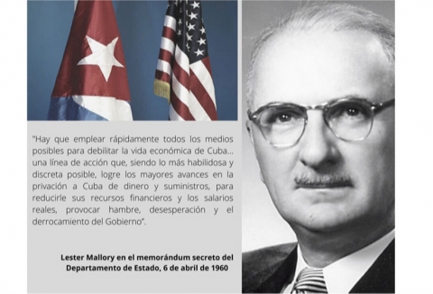 "It is 64 years since the Lester Mallory Memorandum, where the real objective of the cruel economic, commercial and financial blockade of #USA vs #Cuba is explained: to suffocate our country and that deprivations provoke social outbreak. Our denunciation continues: down with the blockade!"