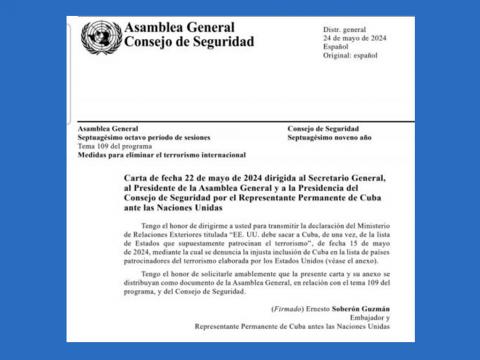 In a statement, also addressed to the president of the United Nations General Assembly and to the presidency of the Security Council, Soberon shared the position of the Ministry of Foreign Affairs (Minrex) entitled “The United States must remove Cuba, once and for all, from the list of States that allegedly sponsor terrorism”.