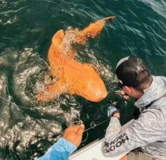 El ejemplar fue capturado en aguas de Costa Rica. Mide más de dos metros y sufre de un rara enfermedad, el xantismo, un trastorno de la pigmentación.
