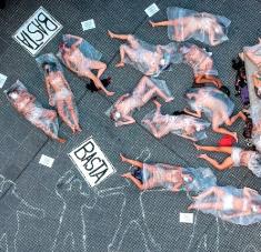 Una representación artística y conmovedora frente a los Tribunales de las mujeres asesinadas en lo que va del año. Foto EFE.