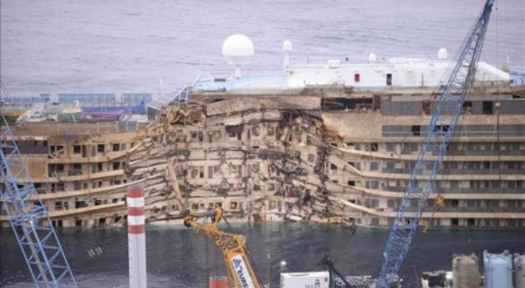 Del mar de la isla del Giglio, donde el crucero había encallado tras la maniobra del capitán Francesco Schettino, acusado ahora de homicidio y abandono del barco, resurgía la otra parte del casco, completamente deformada y abollada al haber quedado aplastada durante 20 meses contra los escollos.
