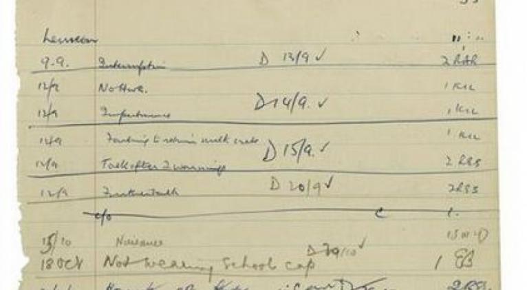 La hoja de castigos será uno de los lotes incluidos en una subasta dedicada a objetos del rock y el pop en la que también se rematará la letra mecanografiada de la canción de Bob Dylan "A Hard Rain's A-Gonna Fall" y el piano que utilizó el grupo ABBA en la mayoría de sus discos.