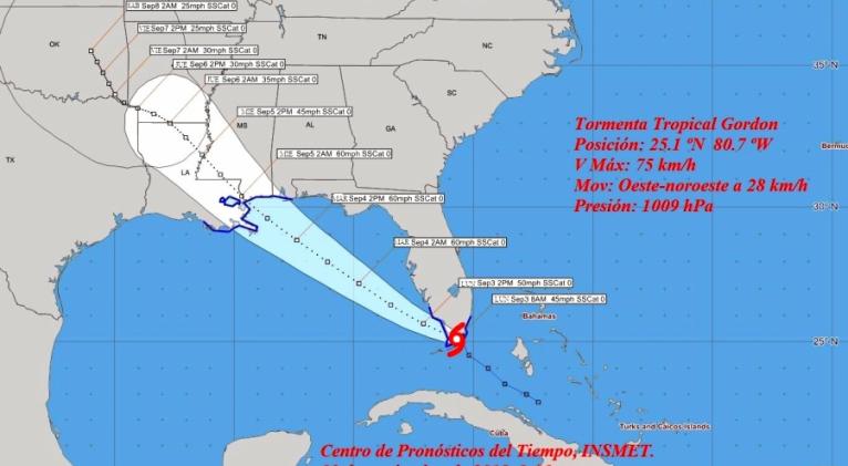 La tormenta tropical Gordon se formó en el estrecho de la Florida durante esta madrugada, con vientos máximos sostenidos de 75 kilómetros por hora y rachas superiores, informó hoy el Instituto de Meteorología de Cuba (Insmet).