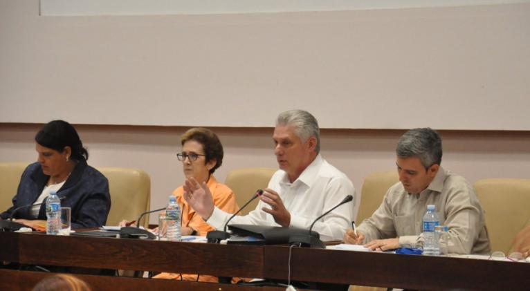 Para realizar un examen integral del tema, en la sala están presentes además Mercedes López Acea, miembro del Buró Político del Comité Central del PCC; Irma Margarita Martínez, ministra presidente del Banco Central de Cuba; Jorge Luis Perdomo Dilella y Betsy Velázquez, titulares de Comunicaciones y Comercio Interior, respectivamente.