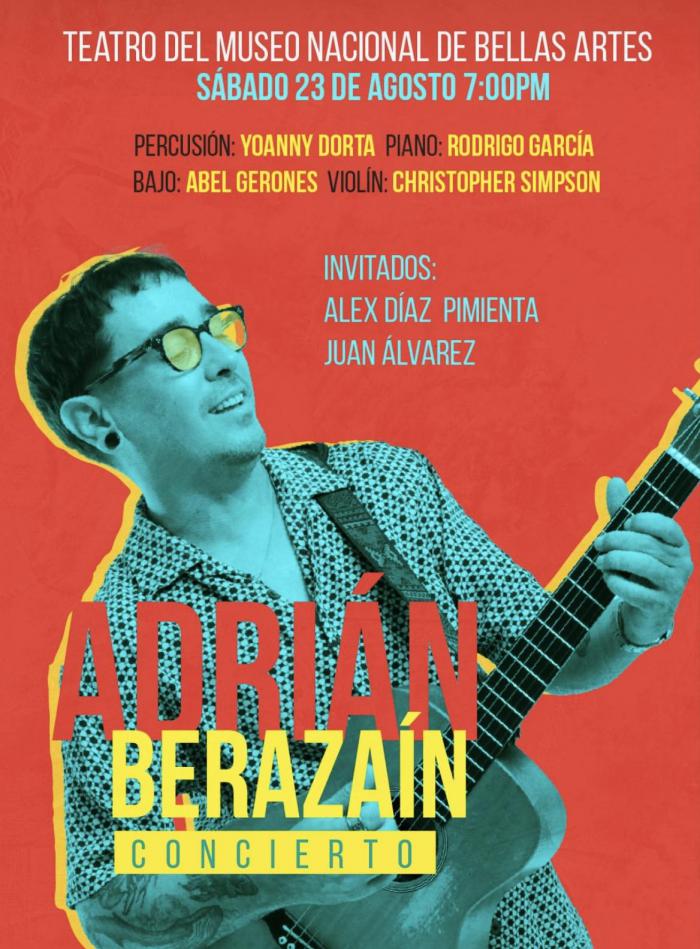 Este sábado, a las 7:00 pm, el teatro del Museo Nacional de Bellas Artes (Arte cubano), acogerá un concierto único de Adrián Berazaín. Esta vez, el artista reúne en el escenario a Abel Gerones, en el bajo; Christopher Simpson, en el violín; Rodrigo García, en el piano; y Yoanny Dorta, en la percusión. Como invitados contará con Alex Díaz Pimienta y Juan Álvarez.