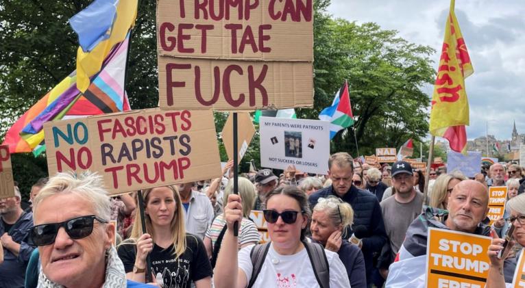 Cientos de personas protestan en Escocia contra Trump mientras juega al golf en Turnberry