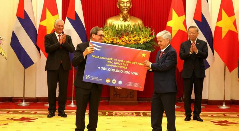 En el acto también hizo uso de la palabra el Presidente vietnamita, Luong Cuong, quien recordó los especiales lazos que unen a ambos pueblos, distinguidos en la famosa frase de Fidel de que «por Vietnam estamos dispuestos a dar nuestra propia sangre». Es este un gesto —dijo— que ha marcado a nuestros dos países.