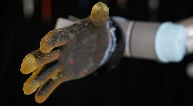 La piel está fabricada con un material de gel flexible y económico y transforma toda la superficie de una mano robótica en un sensor inteligente. Foto: cortesía de la Universidad de Cambridge