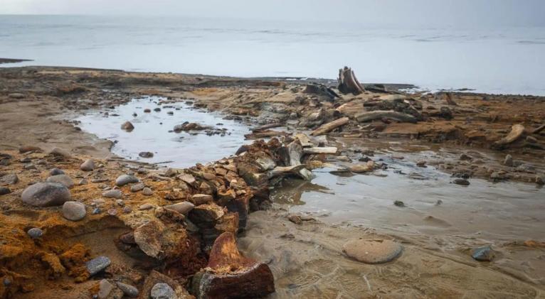 La escena parece detenida en el tiempo. Huesos de cetáceos en sorprendente estado de conservación, algunos emergiendo lentamente de la congelada tierra ártica, otros semienterrados en una terraza marina que hasta hace poco estaba oculta bajo una densa capa de hielo.