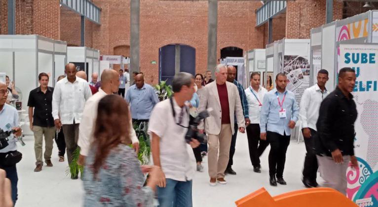 Díaz-Canel Bermúdez hizo un breve recorrido por los stand del recinto, en el cual los participantes muestran sus proyectos editoriales mediante iniciativas innovadoras de la prensa cubana.
