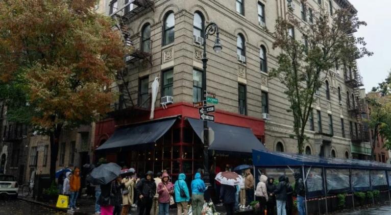 La llovizna no impidió que los visitantes presentaran sus respetos en la reconocible esquina del barrio de moda de West Village donde se asienta el edificio de seis plantas, adornado al estilo clásico neoyorquino con una fachada de ladrillo y escaleras de incendios metálicas.