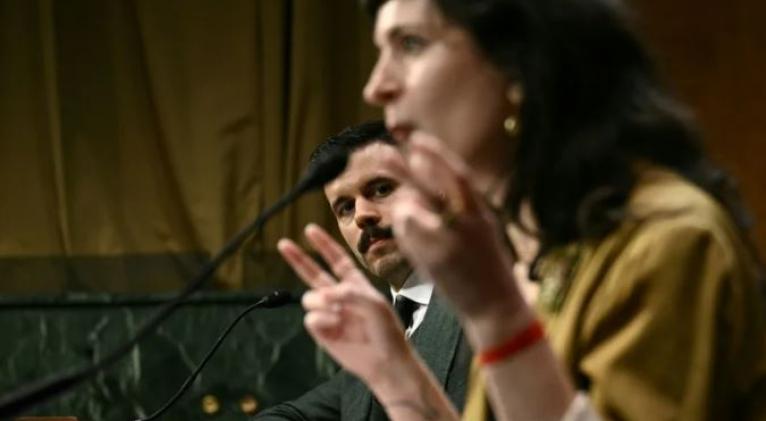 Los exinvestigadores de Meta, Cayce Savage (der.) y Jason Sattizahn, testifican durante una audiencia del Senado en el Capitolio de Washington, Estados Unidos (Brendan SMIALOWSKI)