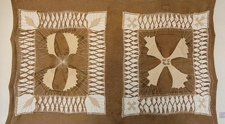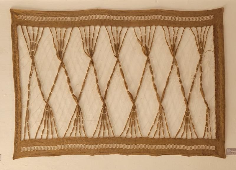 La exposición propone un diálogo entre el bordado, el deshilado y el tejido manual, técnicas tradicionales que en esta ocasión se ejecutan sobre un soporte distinto al habitual: el yute, sustituyendo materiales clásicos como el lino, el hilo o el lienzo.