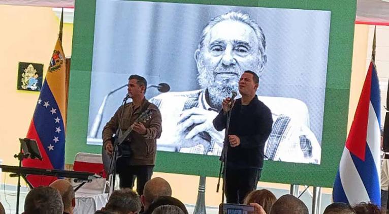 Cantautores de Venezuela y Cuba elevaron sus voces en la Cantata Bolivariana: Fidel en la eternidad, que abrió el dúo Buena Fe con el tema Valientes para decirnos: “Qué estoy haciendo aquí; Amando a este país como a mí mismo. No, qué va. No hay heroísmo; Vine a darle un beso al mundo y nada más”.