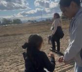 En la imagen, proporcionada por Anabel Romero, aparece su hija de 14 años, derecha, con las manos atadas con bridas, junto a su hija de 8 años, al frente, centro, durante una redada efectuada por varias agencias del orden en el hipódromo La Catedral Arena en Wilder, Idaho, el 19 de octubre de 2025. (Anabel Romero vía AP)