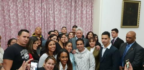 Junto al mandatario estuvieron presentes los miembros de su delegación el vicepresidente del Consejo de Ministros Ricardo Cabrisas; el ministro de Relaciones Exteriores, Bruno Rodríguez; y el vicecanciller Rogelio Sierra.
