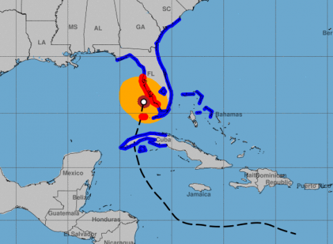 El NHC advirtió que se espera una marejada ciclónica que suponga un peligro para la vida en la costa occidental de Florida y en los Cayos bajos de Florida, con vientos 'devastadores' en el centro del huracán.