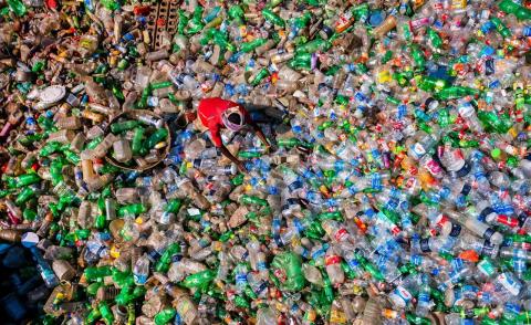 Una alternativa es reciclarlo. Es lo que se hace en la empresa donde se tomó la fotografía, ubicada en Bangladesh. Este trabajador, que parece sumergido en un alud multicolor, clasifica las botellas por tamaño y color. Posteriormente serán convertidas en plástico líquido para fabricar muebles, vasijas y juguetes... que lo más seguro es que, con el tiempo, vuelvan a terminar en una plataforma de desechos.