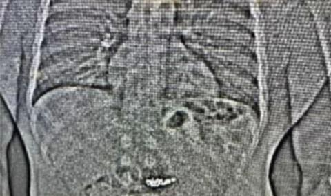Una radiografía de su torso muestra lo que el Departamento de Policía de Orlando cree que son los aretes de diamantes: una masa blanca que brilla intensamente contra el fondo gris de su tracto digestivo.