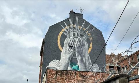Un imponente mural en Francia de la Estatua de la Libertad cubriéndose los ojos está acumulando millones de vistas en línea con su crítica a las políticas de inmigración y deportación del presidente estadounidense Donald Trump.