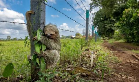 Siguiendo el instinto de su especie, este perezoso de tres dedos de garganta marrón cruzó el camino y se aferró al poste de una cerca. Allí, como era de esperar, se quedó dormido. La fotografía se tomó en San Carlos, Alajuela, Costa Rica. Esa nación cuenta todavía con una de las más variadas y ricas reservas de la fauna y la flora en el mundo. Pero ni siquiera allí la deforestación deja de ser un peligro. Los bosques pierden espacios en favor de la agricultura y el habitat de muchos animales se fragmenta.