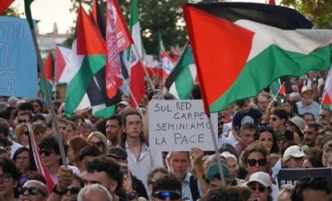 Una multitud de más de 5 mil personas recorrió el pasado sábado 30 de agosto el Gran Viale de la Isla del Lido, epicentro de La Mostra, como también se le conoce al evento, para condenar la crisis humanitaria en Gaza y el genocidio perpetrado por el régimen de Israel.