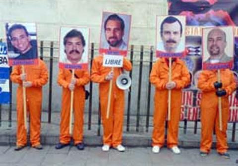Vestidos con uniformes de color naranja similares a los de presos de cárceles estadounidenses y pancartas con las fotos de los Cinco, como se les conoce internacionalmente, los activistas españoles dieron a conocer detalles del caso a asistentes y paseantes.