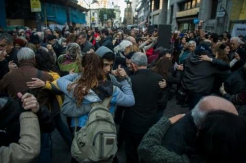 La Asociación de Organizadores de Milongas de Tango organizó su singular manifestación frente al parlamento comunal de Buenos Aires en protesta el 'tarifazo' que ha movilizado a gran parte de los argentinos y también para pedir una ley de fomento a la milonga, una versión del tango que también se usa para llamar los lugares donde se baila.