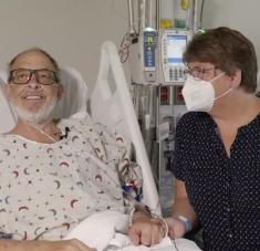 ARCHIVO - En esta foto suministrada por la Escuela de Medicina de la Universidad de Maryland, se ve a Lawrence Faucette acompañado por su esposa, Ann, en el hospital universitario de Baltimore, Maryland, en septiembre de 2023, antes de que le trasplantaran un corazón de cerdo. (Mark Teske / Associated Press)
