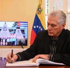 Presidente cubano firma libro de condolencias en la Embajada de Venezuela. Rinde homenaje a los mártires del ataque del 3 de enero y ratifica la alianza contra el imperialismo. Foto: Estudios Revolución