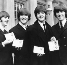 Los integrantes de la banda musical The Beatles, Ringo Starr (2º izq.), John Lennon (2º drcha.), Paul McCartney (izq.) y George Harrison (drcha.), se despiden en el aeropuerto de Tokio el 3 de julio de 1966, al final de una gira por Japón. Handout / Metropolitan Police Department/AFP/Archivos