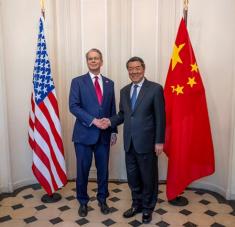 El Secretario del Tesoro de EE.UU., Scott Bessent, y el Viceprimer ministro chino, He Lifeng, en mayo, en Ginebra. Foto: Keystone/EDA/Martial Trezzini (via REUTERS)