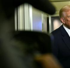 El presidente de Estados Unidos, Donald Trump, habla con unos reporteros a bordo del avión Air Force One durante su ruta hacia Palm Beach, en Florida, el 14 de noviembre de 2025 ( (Jim Watson/AFP/AFP)
