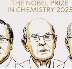 El Premio Nobel de Química se otorga al japonés Susumu Kitagawa, al británico Richard Robson y al estadounidense Omar M. Yaghi, en Estocolmo, el 8 de octubre de 2025. prix Nobel