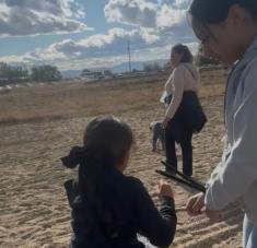 En la imagen, proporcionada por Anabel Romero, aparece su hija de 14 años, derecha, con las manos atadas con bridas, junto a su hija de 8 años, al frente, centro, durante una redada efectuada por varias agencias del orden en el hipódromo La Catedral Arena en Wilder, Idaho, el 19 de octubre de 2025. (Anabel Romero vía AP)