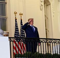 US President Donald Trump without a face mask on a White House after hospitalization for coronavirus disease (COVID-19) treatment, in Washington, U.S. October 5, 2020 © REUTERS / Erin Scott