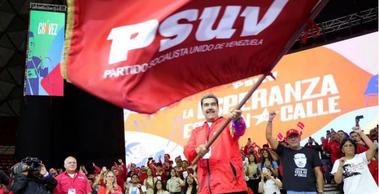 El presidente de Venezuela, Nicolás Maduro, ondea una bandera del partido frente a sus seguidores, después de aceptar la candidatura para postularse a otro mandato en las elecciones del 28 de julio de 2024. Miraflores Palace (via REUTERS)