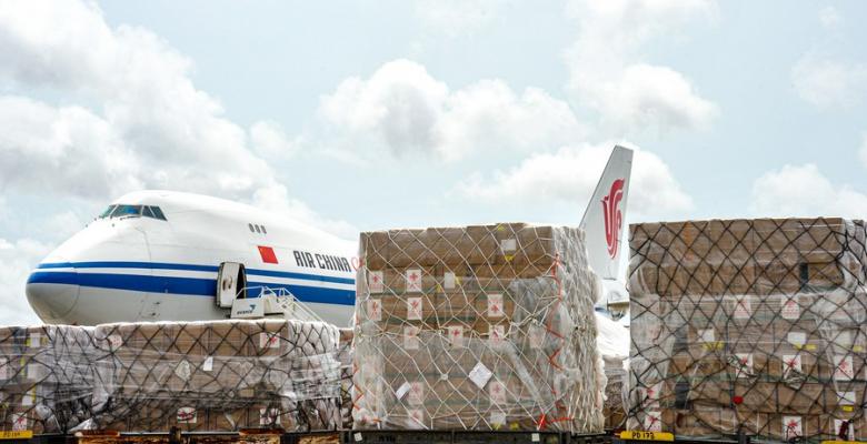 Suministros médicos chinos para 18 países africanos llegan al Aeropuerto Internacional Kotota en Acra, capital de Ghana, el 6 de abril de 2020. (Xinhua/Xu Zheng)