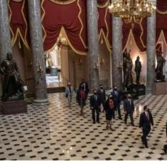 Los demócratas a cargo de la acusación en el juicio político a Donald Trump, aquí cruzando la Rotonda del Capitolio el 9 de febrero de 2021, instalaron pantallas y equipos de audio en el Senado para mostrar los videos del caos de la toma del Capitolio. afp_tickers