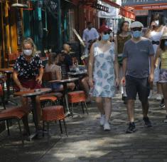 A una niña con mascarilla para protegerse del nuevo coronavirus le toman la temperatura en un puesto de control policial en la entrada de la provincia de La Habana, Cuba, el lunes 10 de agosto de 2020. (AP Foto/Ramón Espinosa)