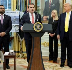 El presidente de Estados Unidos, Donald Trumpl, junto al director del FBI, Kash Patel; y la fiscal general Pam Bondi, y el fiscal general adjunto Todd Blanche.. Foto: Reuters