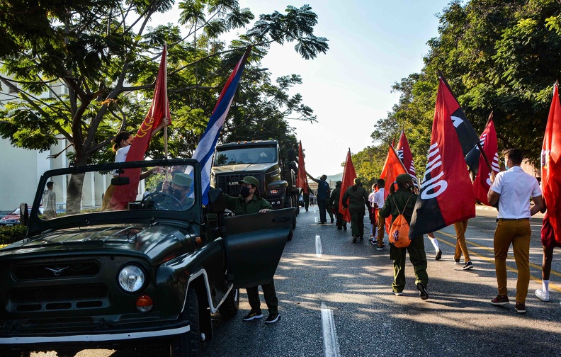 Una representación de jóvenes y niños, vestidos de verde olivo, rememoraron la Caravana de la libertad en el 63 aniversario del histórico recorrido de Santiago de Cuba hasta La Habana. Santiago de Cuba, 2 de enero de 2022. ACN FOTO/Miguel RUBIERA JUSTIZ