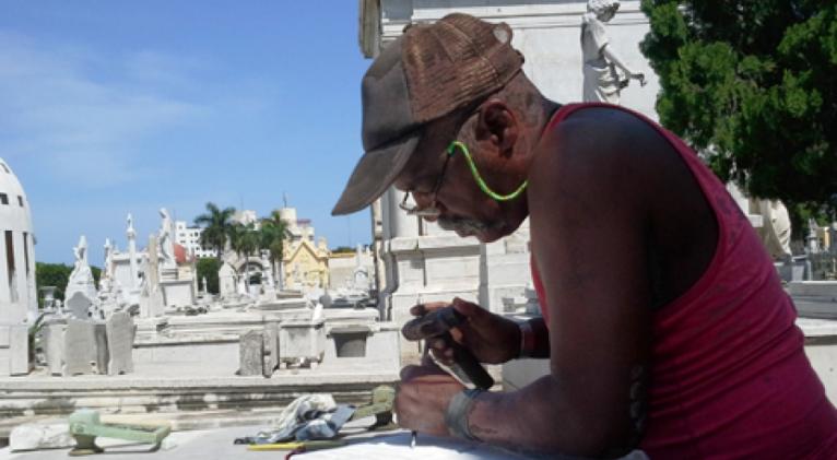 Al preguntarle si no teme quedarse sin trabajo porque cada vez aumenta el número de cremaciones, detiene el rítmico golpeteo del cincel de uña para responder convencido: «Es así, pero esta fábrica nunca para, mi’ja», y con un gesto del brazo trata de abarcar la necrópolis toda.