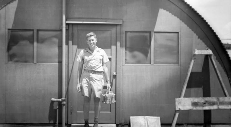 En foto de 1945, un físico sonríe mientras sujeta el núcleo de la bomba atómica
