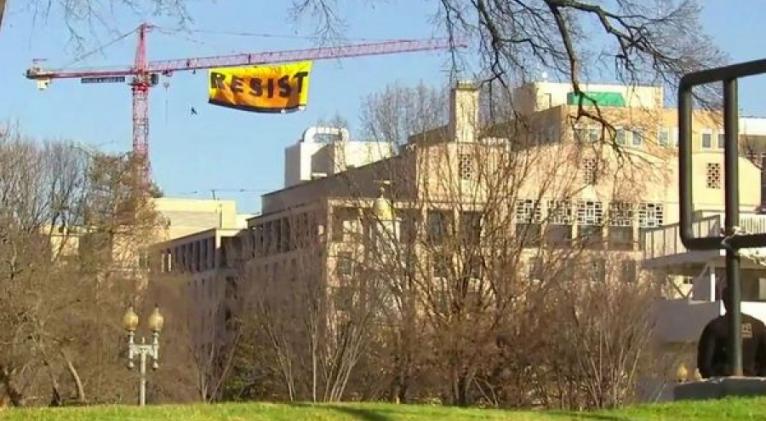 Siete manifestantes subieron a lo alto de una grúa de construcción de más de 80 metros, utilizada en una obra a pocas cuadras del edificio presidencial, y desplegaron una bandera naranja y amarilla de 20 metros de largo por 10 de ancho en la que se lee la palabra Resist (Resistir).