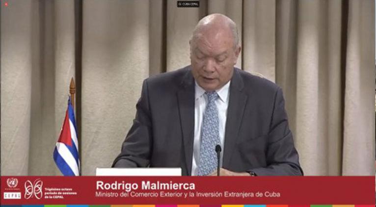 Rodrigo Malmierca, ministro de Comercio Exterior y de la Inversión Extranjera de Cuba (MINCEX), expuso hoy la experiencia cubana sobre la recuperación económica pos-COVID-19, en el diálogo de cancilleres y de altas autoridades de América Latina y el Caribe de la Comisión Económica para América Latina y el Caribe (Cepal).