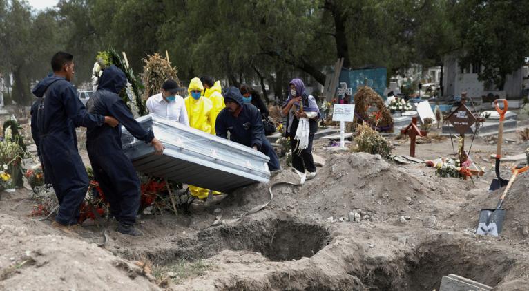 Trabajadores y familiares de un fallecido por covid-19 llevan un ataúd en el cementerio de San Lorenzo Tezonco, Ciudad de México, el 3 de junio de 2020. Reuters