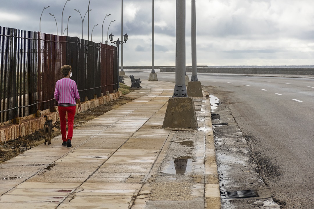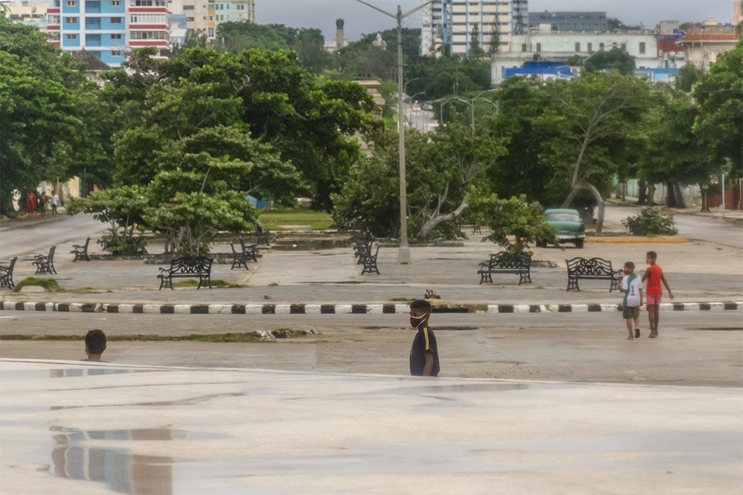 Algún que otro dueño de paseo con su perro aprovechando la ausencia de chubascos, familias, grupos de niños no mayores de 12 años por las calles sin la supervisión de un adulto y oficiales de la seguridad atentos ante el deterioro del entorno y medidas necesarias a adoptar. No obstante, nos encontramos con drenajes tupidos cuando apenas ha llovido en La Habana.